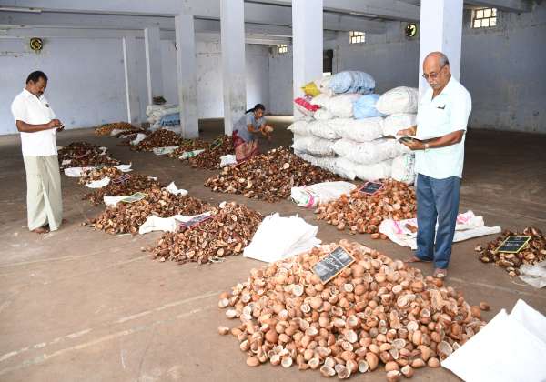மின்னணு முறையில் ஏலம் விடுவதற்காக உடுமலை ஒழுங்குமுறை விற்பனை கூடத்தில் விவசாயிகள் கொண்டு வந்த கொப்பரைகள் வரிசையாக குவித்து வைக்கப்பட்டுள்ளன.