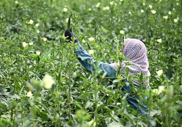 சென்னை பொழிச்சலூர் பகுதியில் பயிரிடப்பட்ட வெண்டைக்காய் செடிகளில் இருந்து வெண்டைக் காய்களை அறுவடை செய்யும் பணியில் ஈடுபட்டுள்ள விவசாயிகள்.