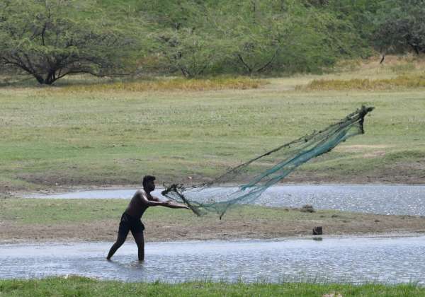 திருநெல்வேலி மாவட்டம் சீவலப்பேரி அருகே உள்ள குளத்தில் தண்ணீர் வற்றிவரும் நிலையில் வலை போட்டு மீன் பிடிக்கும் பணியில் ஈடுபட்டுள்ள மீனவர்.