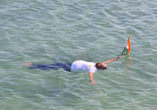 ராமேஸ்வரம் அருகே வில்லூண்டி தீர்த்த கடலில் மிதந்தபடி யோகா பயிற்சியாளர் சுடலை தேசிய கொடியை ஏந்திக் கொண்டு ஜலசாசனம் செய்தார்.