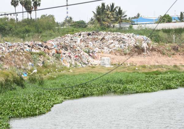 மங்கலம் நொய்யல் ஆற்றின் கரையில் குப்பைகளை மலை போல குவித்து வைத்துள்ளனர்.