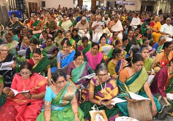 கோவை ராம்நகர் ஐயப்ப பூஜா சங்கத்தில் நடந்த ஜென்ம தின வைபவம் நிகழ்ச்சியில் பாராயணம் பாடிய பக்தர்கள்.