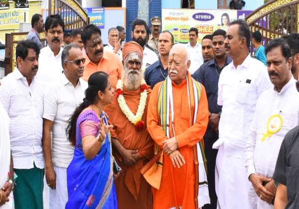 கோவை பேரூர் படித்துறையில் புதிய தர்ப்பணம் மண்டபத்தை ஆர் எஸ் எஸ் அமைப்பின் தலைவர் மோகன் பகவத் பார்வையிட்டார். அருகில் முன்னாள் அமைச்சர் வேலுமணி, நல்லறம் அறக்கட்டளை தலைவர் அன்பரசன், பேரூர் ஆதீனம் மருதாசல அடிகளார் உள்ளிட்டோர்.
