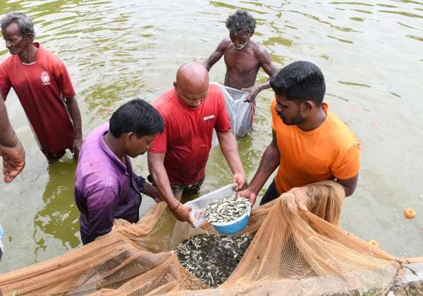 உடுமலை அமராவதி நகர் மீன் பண்ணையில் வளர்க்கப்பட்ட ரோகு குஞ்சுகளை பவானிசாகர் அணைக்கு கொண்டு சென்று விடுவதற்காக பிடிக்கும் தொழிலாளர்கள் .