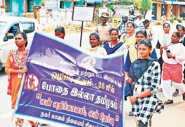 உலக போதை ஒழிப்பு தினத்தை முன்னிட்டு சிவகங்கையில் காவல்துறை சார்பில் நடந்த ஊர்வலத்தில் பங்கேற்ற அரசு பெண்கள் கல்லூரி மாணவிகள்