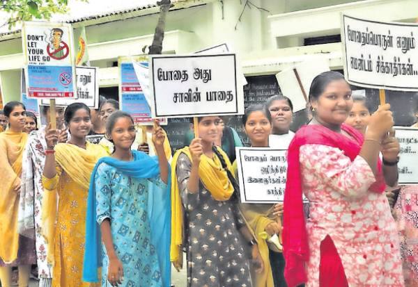 போதை ஒழிப்பு ஊர்வலத்தில் பங்கேற்ற மன்னர் திருமலை நாயக்கர் கல்லூரி மாணவியர்