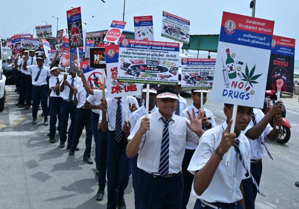 சர்வதேச போதை பொருள் ஒழிப்பு தினத்தை முன்னிட்டு சென்னை மெரினா பட்டினப்பாக்கம் லூப் சாலையில் காவல்துறையினருடன் இணைந்து பள்ளி, கல்லூரி, மாணவ மாணவிகளின் விழிப்புணர்வு பேரணியில் ஏராளமானோர் பங்கேற்றனர்.