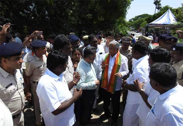 காஞ்சிபுரம் புதிய ரயில் நிலையம் அருகே இந்திரா நகர் பகுதியை ஆய்வு செய்த மத்திய ரயில்வே இணை அமைச்சர் சோமண்ணா.