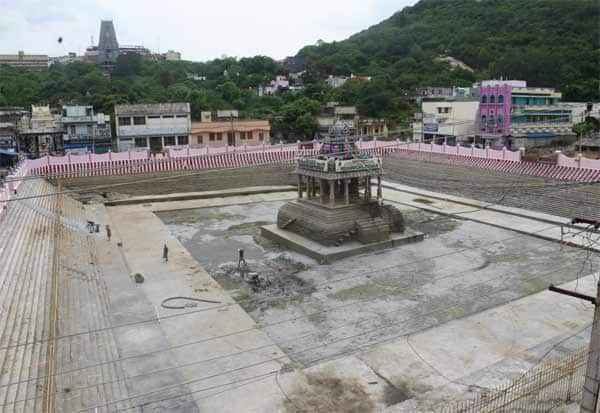 திருத்தணி, முருகன் கோவில் குளம் தூர் வாரி சீரமைக்கும் பணி நடந்து வருகிறது.