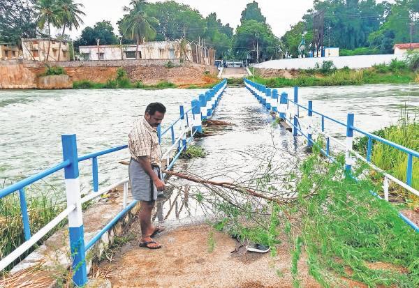 வைகை அணையிலிருந்து திறக்கப்பட்ட தண்ணீர் தரைப்பாலத்தை மூழ்கடித்து செல்வதால் சுற்றுலா பயணிகளுக்கு தரைப்பாலத்தில் நடக்க தடை விதிக்கப்பட்டுள்ளது