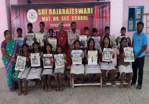 திண்டிவனம் பெலாகுப்பம் ஸ்ரீ ராஜராஜேஸ்வரி மெட்ரிக் மேல்நிலைப் பள்ளியின் நிர்வாகி பாலசுப்ரமணியன் மற்றும் முதல்வர் நாராயணன் மாணவ மாணவிகளுக்கு தினமலர் பட்டம் இதழ் வழங்கினார்கள் உடன் ஆசிரியர்கள்.