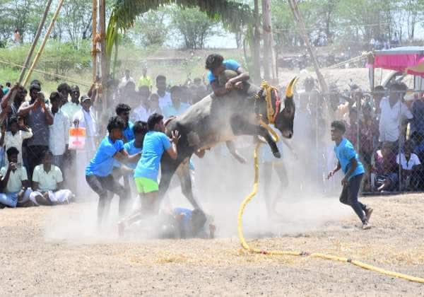 பரமக்குடி அருகே நயினார் கோவில் ஒன்றியம் கடம்பூர் கிராமம் முத்து மாரியம்மன் கோயில் விழாவில் நடந்த வடமாடு நிகழ்ச்சியில் துள்ளி வந்த காளையை இளைஞர்கள் அடக்கினர்.