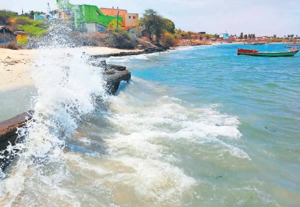 காற்றின் வேகத்தால் கீழடி ஜெட்டிப்பாலம் அருகே சீறி எழுந்த கடல் அலை