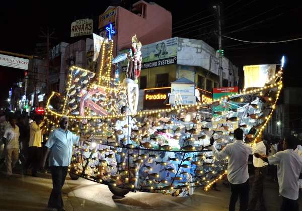 மேட்டுப்பாளையம் அந்தோணியார் கோவில் தேர் திருவிழாவில் மின்விளக்கு அலங்கார படகில் பவனி வந்த அந்தோணியார்.