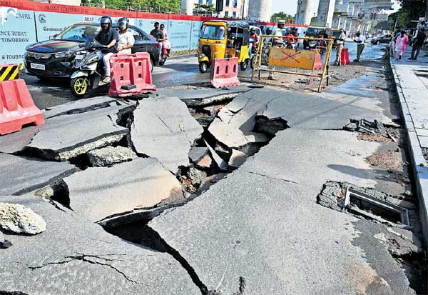 கழிவு நீர் குழாய் வெடித்ததில் சேதம் அடைந்த சாலை இடம்: திருமங்கலம்.