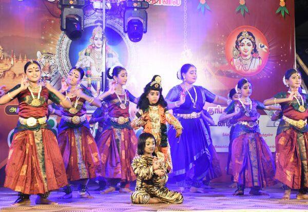 திருப்பூர்; சாய் கிருஷ்ணா நுண்கலை கூடம் குழுவினரினர், அய்யப்பனின் வரலாற்றை, பரதநாட்டியம் மூலம் தத்ரூபமாக நடித்துக்காட்டினர்.