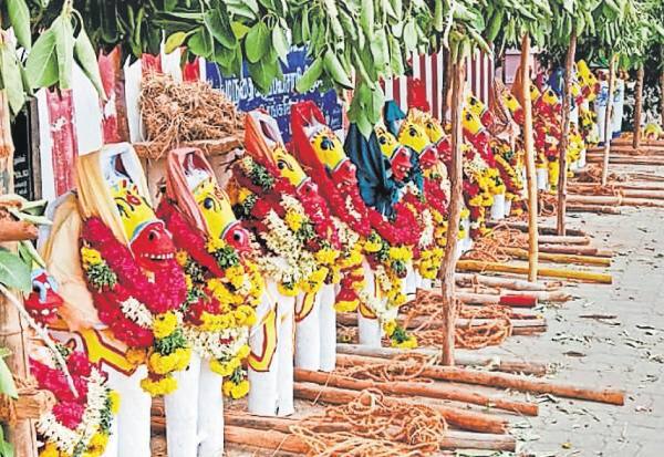உறங்கான்பட்டி நாட்டாமுத்தி அய்யனார் கோவில் திருவிழாவில் கலந்து கொள்ள மந்தையில் தயார்நிலையில் புரவிகள்