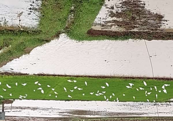 இரை தேடும் கொக்கு கூட்டங்களால் நாற்றங்கால்கள் சேதம்.... இடம் : கோகிலாபுரம்