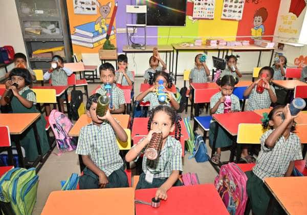 தமிழக பள்ளிகளில் வாட்டர் பெல் திட்டம் என குழந்தைகள் தண்ணீர் குடிக்க நேரம் ஒதுக்கியது அமலுக்கு வந்த நிலையில் சென்னை லேடி வில்லிங்டன் பள்ளியில் தண்ணீர் குடிக்கும் பள்ளிக் குழந்தைகள்.