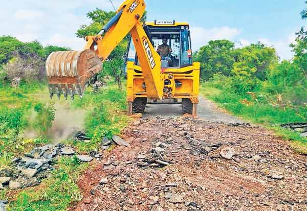 முதல்வரின் கிராம சாலை மேம்பாட்டு திட்டத்தில் புதிய சாலை போடும் பணிக்கு பொக்லைன் இயந்திரம் மூலமாக பழைய சாலை பெயர்த்தெடுக்கப்படுகிறது. இடம்: படுநெல்லி