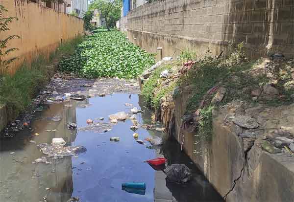 முகலிவாக்கம் பகுதியில் ஆக்கிரமிப்பால் சுருங்கி பராமரிப்பின்றி காணப்படும் மணப்பாக்கம் கால்வாய்.