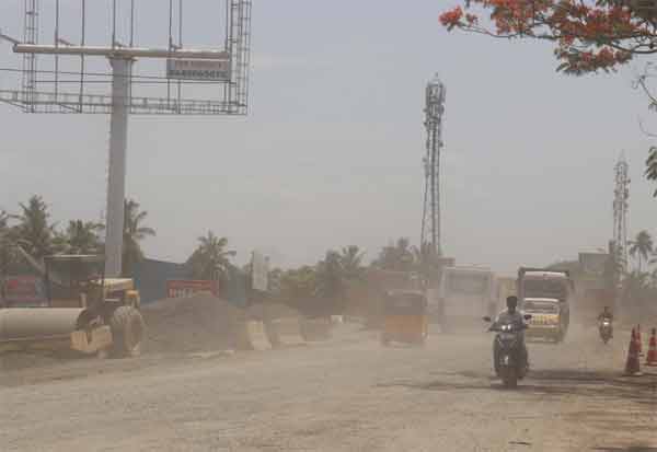 புழுதி பறக்கும் சாலையில் வாகன ஓட்டிகள் தடுமாற்றத்துடன் சென்றனர். இடம்: கீழம்பி.