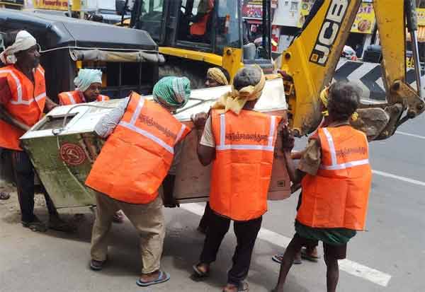நடைபாதையில் இருந்த ஆக்கிரமிப்பை அகற்றும் நெடுஞ்சாலை துறை ஊழியர்கள். இடம்: கொட்டிவாக்கம். ஓ.எம்.ஆர்.,