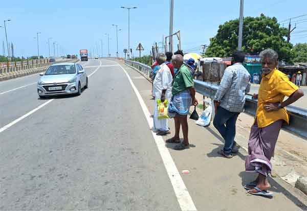 கவரப்பேட்டை அடுத்த புதுவாயல் சந்திப்பில் இணைப்பு சாலை வழியாக செல்வதை பேருந்துகள் தவிர்ப்பதால் தேசிய நெடுஞ்சாலையோரம் காத்திருக்கும் பயணியர்.
