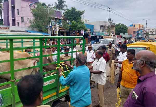 கோவர்தணகிரி சாலையில் சுற்றித்திரிந்த மாடுகளை ஊழியர்கள் பிடித்து வாகனத்தில் ஏற்றினர். இடம்: ஆவடி.