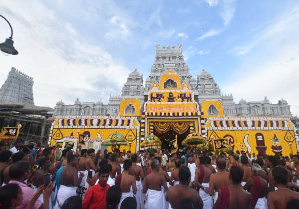 திருச்செந்தூர் சுப்பிரமணிய சுவாமி கோவில் கும்பாபிஷேகம் வரும் 7 ஆம் தேதி நடக்கவுள்ள நிலையில் நேற்று யாகசாலை பூஜைகள் துவங்கின. கோவில் முகப்பு வண்ண பூக்களால் அலங்கரிக்கப்பட்டுள்ளது.
