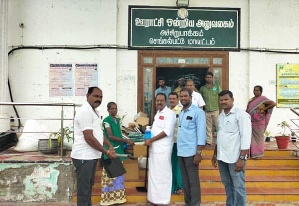 அச்சிறுபாக்கம் வட்டார துாய்மை பணியாளர்களுக்கு திடக்கழிவு மேலாண்மை திட்டத்தின் மூலம் பாதுகாப்பு உபகரணங்கள் மற்றும் துாய்மை பணிக்கான உபகரணங்கள் வழங்கப்பட்டன.