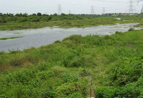 ஆத்தூர் பாண்டிக்காவனூர் கிராமங்களுக்கு இடையே கொசஸ்தலை ஆற்றில் தடுப்பணை அமைக்க சமூக ஆர்வலர்கள் வலியுறுத்தப்படும் பகுதி. இடம்: சோழவரம்.