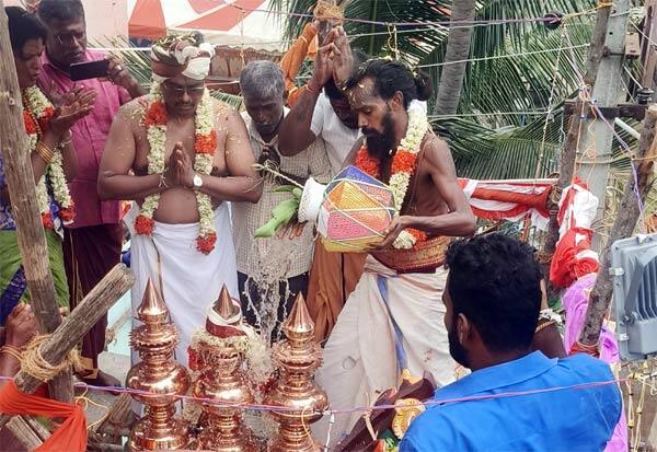 அம்மை மரகதாம்பிகை சமேத புண்ணிய கோட்டீஸ்வரர் கோவிலில் நடந்த கும்பாபிஷேக விழாவில் கோபுர கலசங்களுக்கு புனிதநீர் ஊற்றப்பட்டது. இடம்: திருமழிசை.