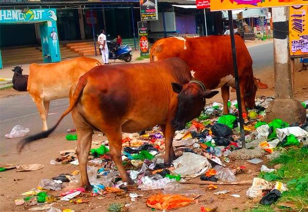 சாலையோரம் வீசப்பட்டுள் பிளாஸ்டிக் கழிவுகளை உண்ணும் மாடுகள்.இடம்: ஊத்துக்கோட்டை.