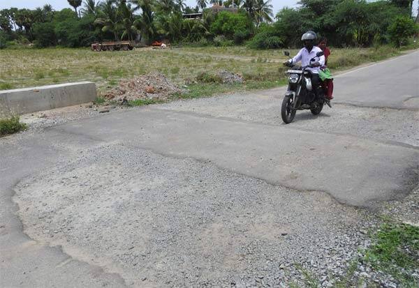 மெதூர் -கோளூர் சாலையில் கரடு முரடாக உள்ள பாலத்தின் இணைப்பு சாலையை தடுமாற்றத்துடன் கடக்கும் வாகன ஓட்டிகள். இடம்: பொன்னேரி.