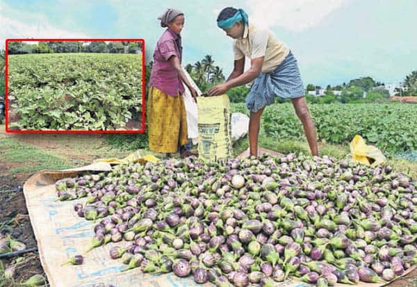 உடுமலையில், கத்திரி செடிகளில் பறிக்கப்பட்ட காய்களை, விற்பனைக்கு கொண்டு செல்வதற்காக தரம் பிரித்து வைத்துள்ளனர். உள்படம்: கிணற்று பாசனத்தில் பயிரிடப்பட்டுள்ள கத்திரி செடிகள்