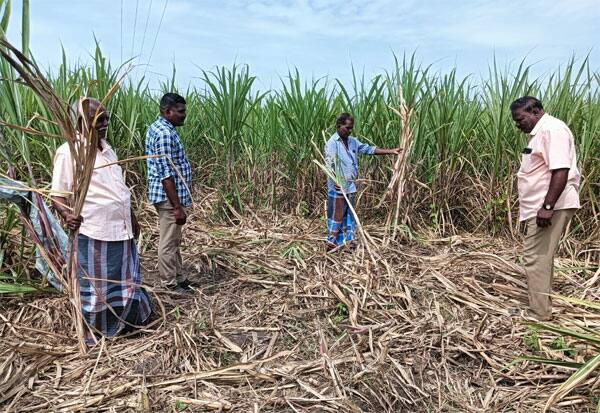 சீட்டணஞ்சேரியில் காட்டுப்பன்றிகளால் சேதம் அடைந்த கரும்பு பயிர்களை அதிகாரிகளிடம் அடையாளம் காட்டும் விவசாயிகள்.