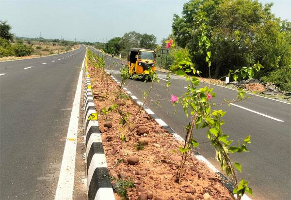 திருவள்ளூர் அரக்கோணம் நான்கு வழி சாலை மைய தடுப்பில் வைக்கப்பட்டு ள்ள பூச்செடிகள். இடம்: வியாசபுரம்.