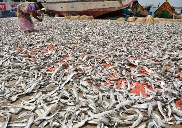 சென்னையில் வெயிலின் தாக்கம் அதிகரித்து காணப்படுவதால் காசிமேடு மீன்பிடி துறைமுகத்தில் கருவாடு காய வைக்கும் பணியில் ஈடுபட்டுள்ள பெண்.