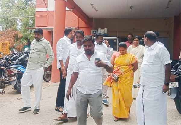 நகராட்சி துணை தலைவர் சிவலிங்கம் தலைமையில் மதுராந்தகம் காவல் நிலையத்தில் புகார் அளித்து விட்டு திரும்பிய தி.மு.க., கவுன்சிலர்கள். இடம்: மதுராந்தகம்.