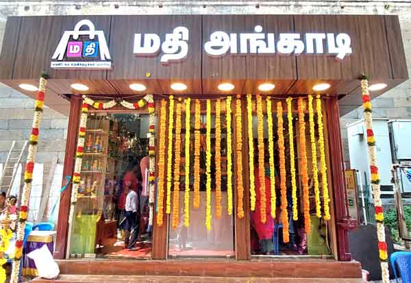 காஞ்சிபுரம் வரதராஜ பெருமாள் கோவில் அருகே மகளிர் சுயஉதவிக்குழுவினரின் உற்பத்தி பொருட்களை விற்பனை செய்ய திறக்கப்பட்டுள்ள அங்காடி.