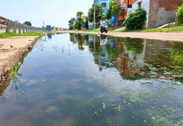 சென்னை- கோல்கட்டா தேசிய நெடுஞ்சாலையின் இணைப்பு சாலையில் வடிந்து செல்ல வழியின்றி தேங்கியுள்ள கழிவுநீர். இடம்: சின்னஓபுளாபுரம். கும்மிடிப்பூண்டி.