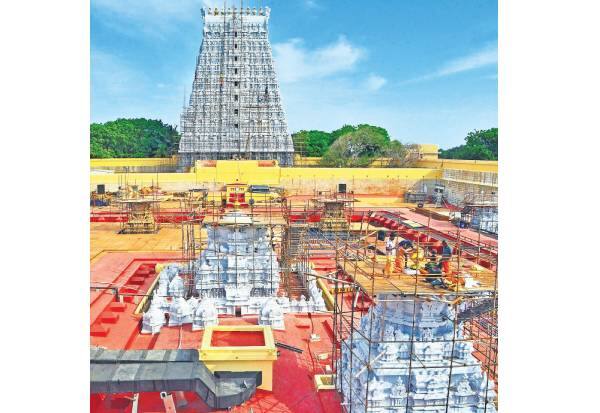 திருச்செந்தூர் சுப்பிரமணிய சுவாமி கோவிலில் மகா கும்பாபிஷேக விழாவை முன்னிட்டு சண்முகர் விமானத்தில் தங்கத்தகடுகள் பதிக்கப்பட்ட கலசம் நேற்று பொருத்தப்பட்டது.