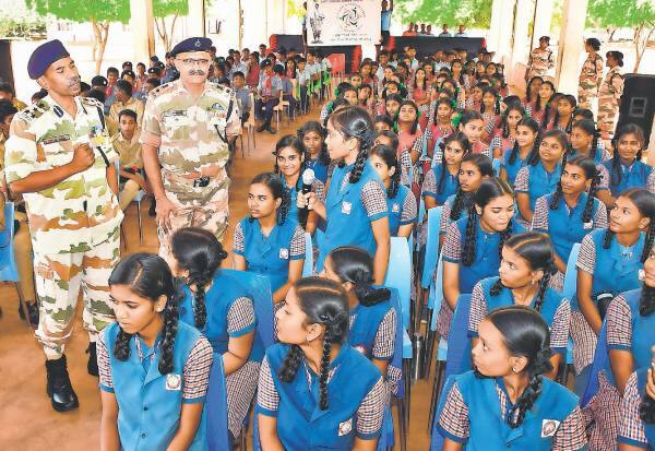 சிவகங்கை அருகே பள்ளி மாணவர்களுக்கான போதைப் பொருள் விழிப்புணர்வு நிகழ்ச்சியில் டி.ஐ.ஜி., ஜஸ்டின் மாணவிகளுக்கு விளக்கம் அளித்தார்.