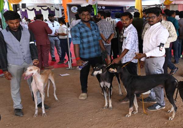 மதுரையில் கெனைன் கிளப் சார்பில் நடந்த அகில இந்திய நாய்கள் கண்காட்சியில் நாட்டு இன நாய்கள் கண்காட்சி போட்டியில் உரிமையாளருடன் பங்கேற்ற நாய்கள்.