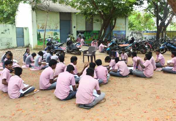 திருவள்ளூர் ஒன்றியம காக்களூர் மேல்நிலைப் பள்ளியில் உள்ள வகுப்பறைகள் குறுகலாக உள்ளதால், இடநெருக்கடி காரணமாக, மாணவர்கள் மரத்தடியில் பயின்று வருகின்றனர்.