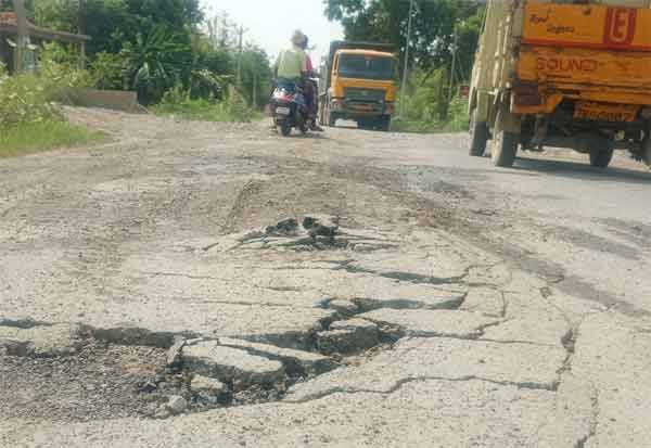 உத்திரமேரூர் அருகே உள்ள அருங்குன்றத்தில் சேதமடைந்துள்ள சாலையை சீரமைக்க வாகன ஓட்டிகள் வலியுறுத்தி வருகின்றனர்.