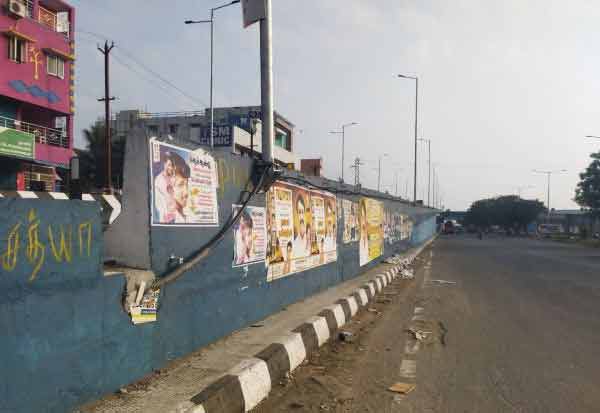 சிங்கபெருமாள் கோவில் மேம்பாலத்தில் ஒட்டப்படும் போஸ்டர்களால் பாலம் அலங்கோலமாக காட்சியளிக்கிறது.