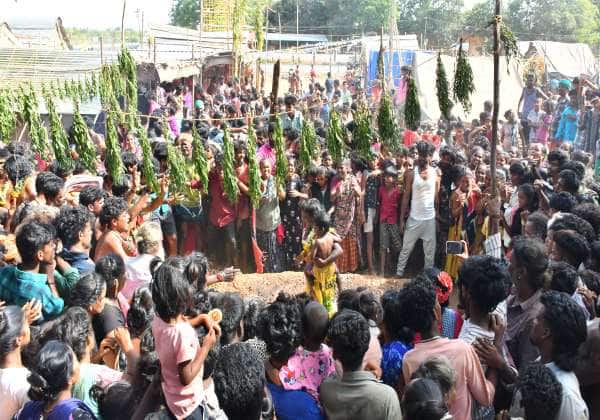 சிவகங்கை பையூர் பழமலை நரிக்குறவர் குடியிருப்பில் காளியம்மன் மீனாட்சி அம்மன் கோயில் திருவிழாவை முன்னிட்டு பக்தர்கள் பூக்குழி இறங்கினர்.