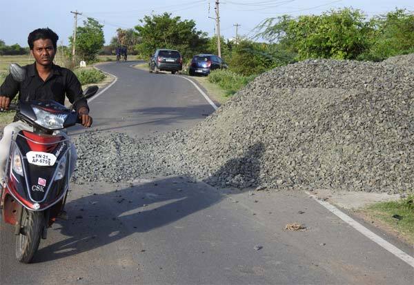 காஞ்சிபுரம் அடுத்த, ஏனாத்துார் கிராமத்தில் இருந்து, மருதம் கிராமம் வழியாக, தென்னேரி கிராமத்திற்கு செல்லும் சாலையோரம் வாகன ஓட்டிகளுக்கு இடையூறாக ஜல்லி கற்கள் கொட்டப்பட்டு உள்ளன.